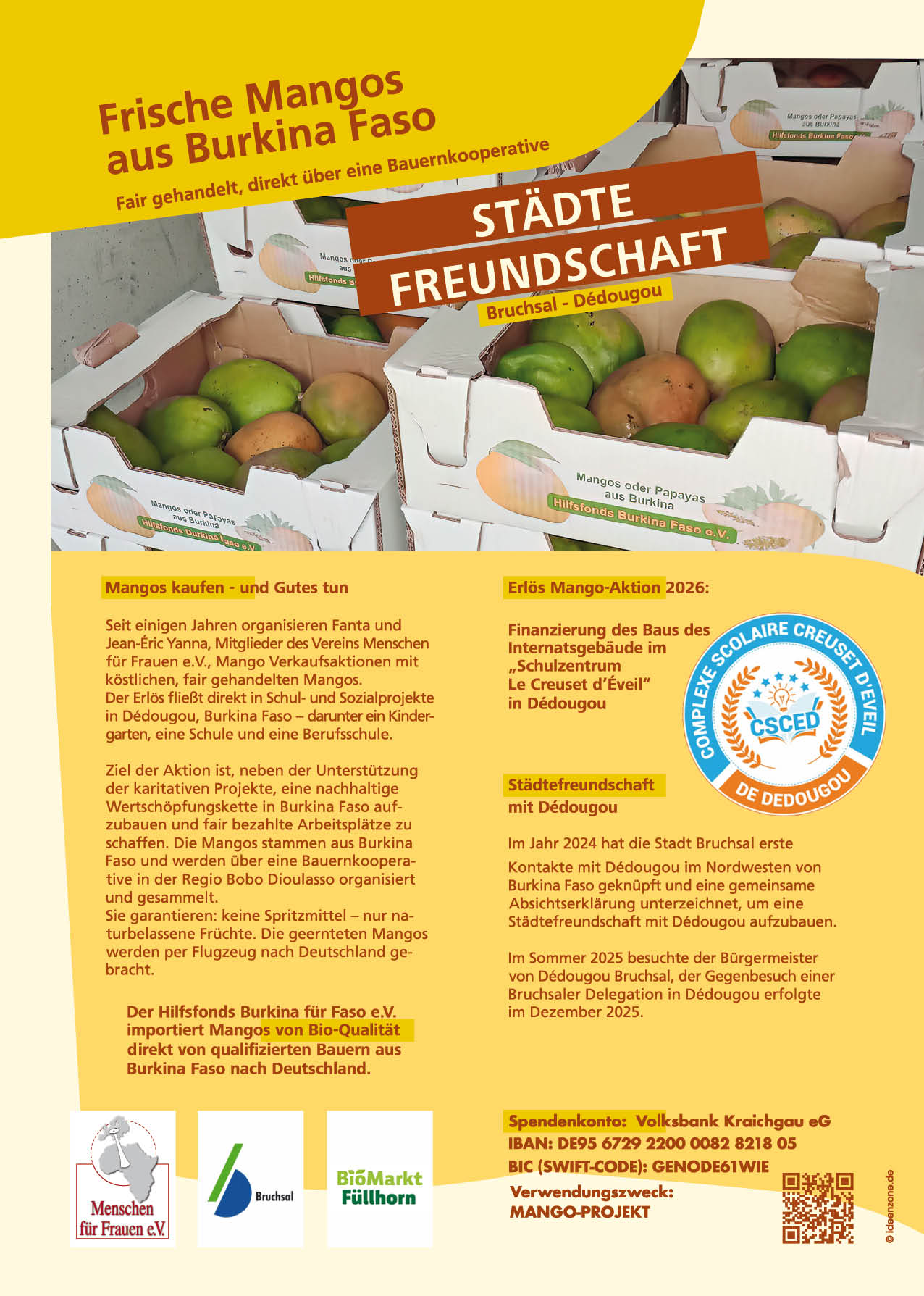 Seit einigen Jahren organisieren Fanta und Jean-Éric Yanna, Mitglieder des Vereins Menschen für Frauen e.V., Mango Verkaufsaktionen mit köstlichen, fair gehandelten Mangos. Der Erlös fließt direkt in Schul- und Sozialprojekte in Dédougou, Burkina Faso – darunter ein Kindergarten, eine Schule und eine Berufsschule. Ziel der Aktion ist, neben der Unterstützung der karitativen Projekte, eine nachhaltige Wertschöpfungskette in Burkina Faso aufzubauen und fair bezahlte Arbeitsplätze zu schaffen. Die Mangos stammen aus Burkina Faso und werden über eine Bauernkooperative in der Regio Bobo Dioulasso organisiert und gesammelt. Sie garantieren: keine Spritzmittel – nur naturbelassene Früchte. Die geernteten Mangos werden per Flugzeug nach Deutschland gebracht.